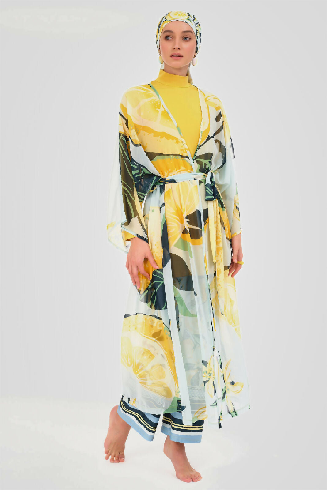 قبعة + حجاب / سكارف + صدرية + توب بلون أصفر سادة + بنطلون بنقش متناسق + كاش مايو طويل بنقش صيفي مميز مع حزام