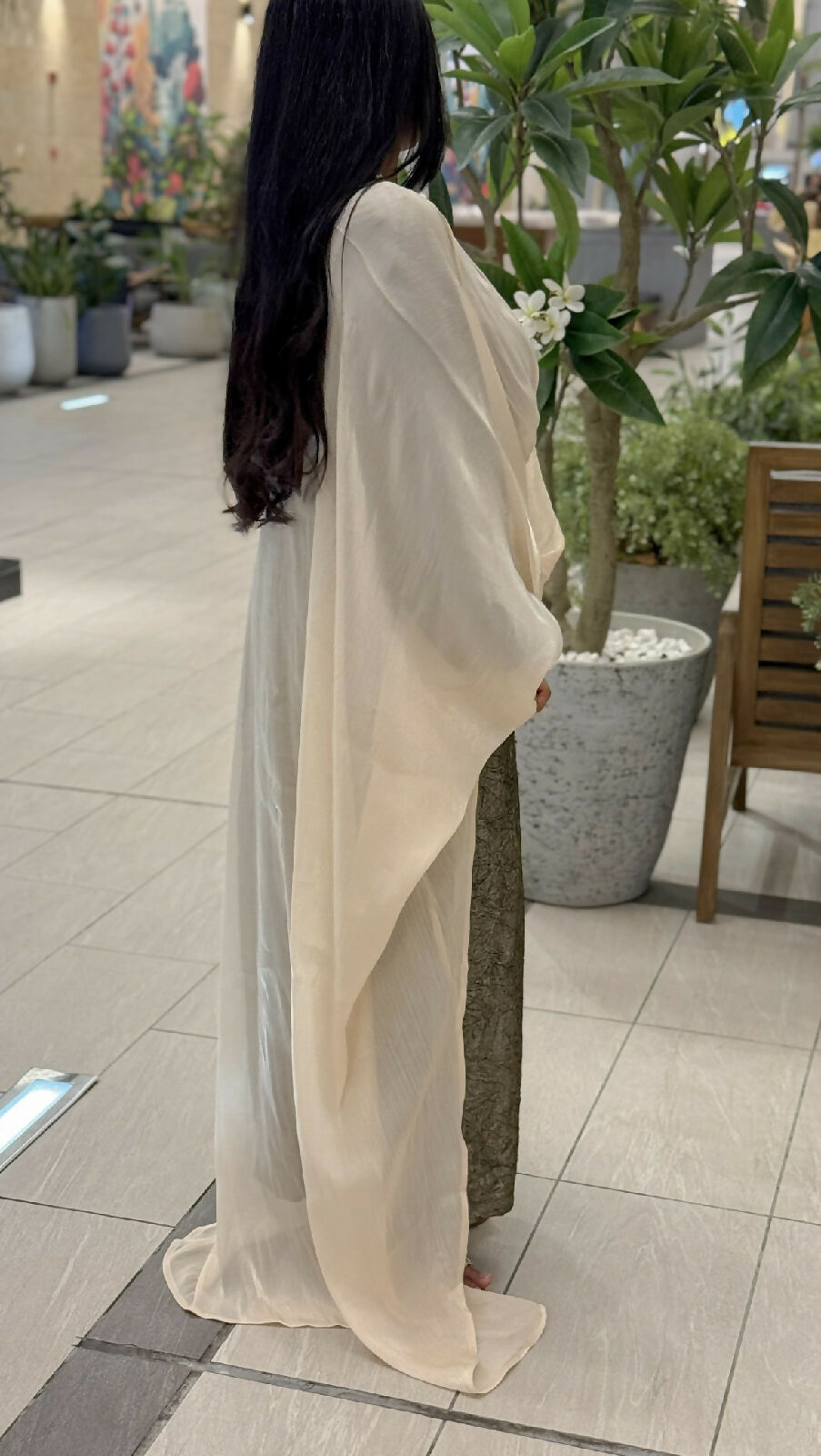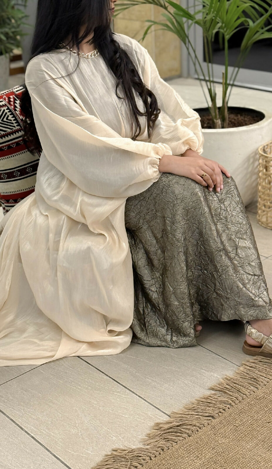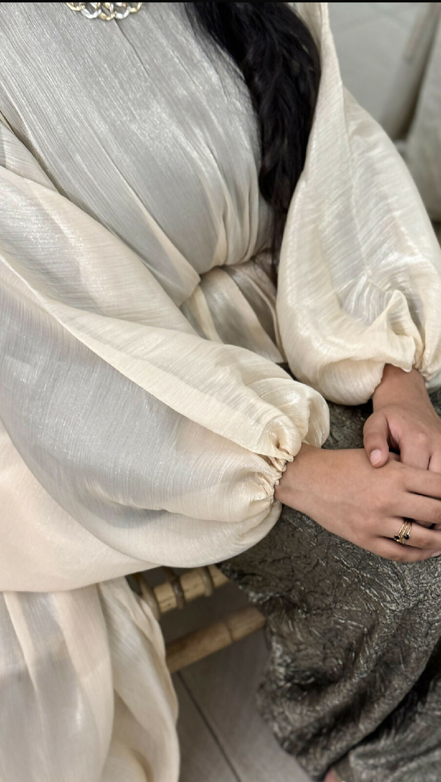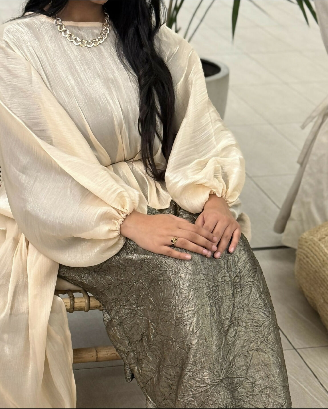 “A chic satin top with puff sleeves paired with a metallic textured skirt for an elegant, modern look.
