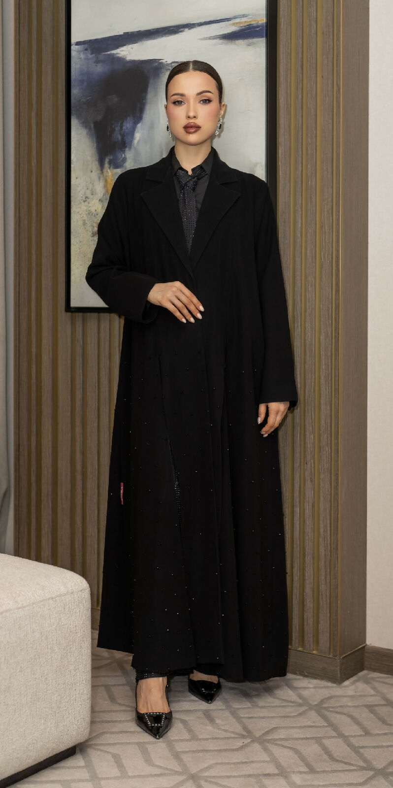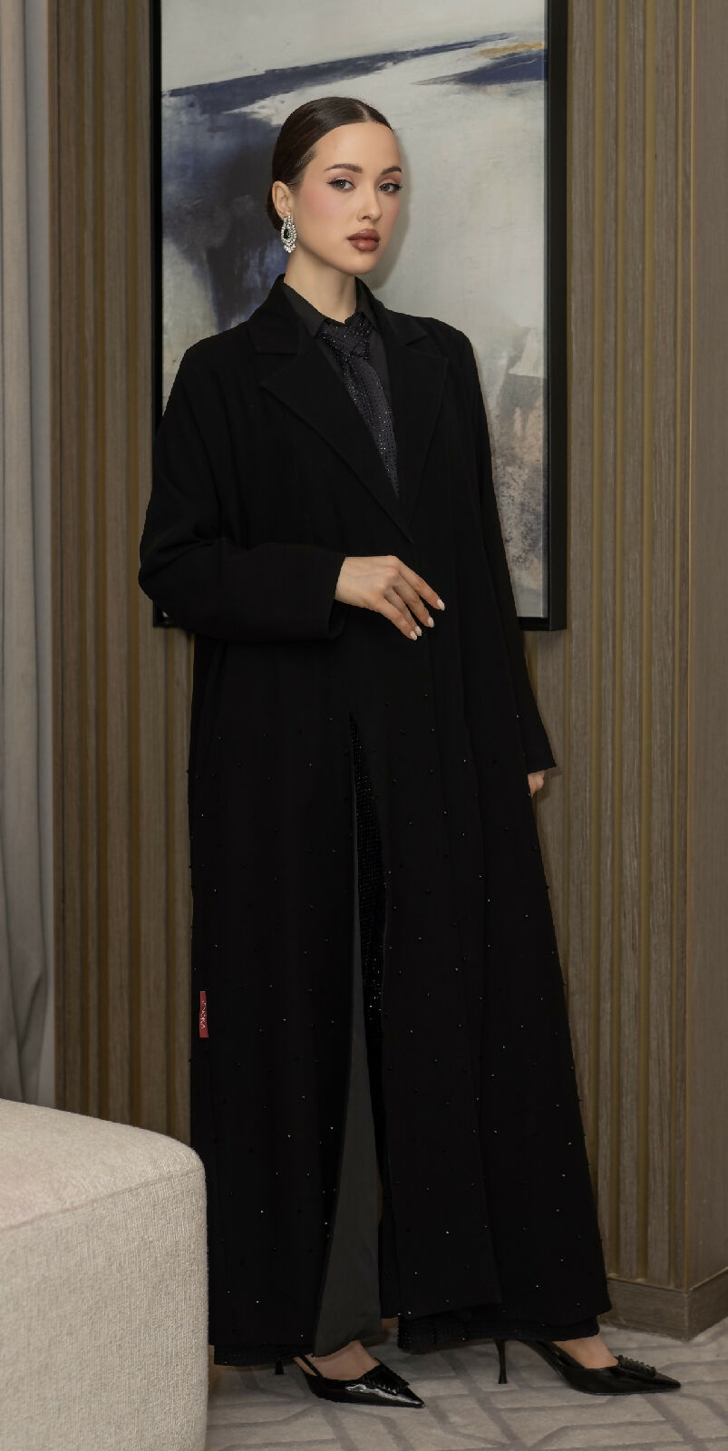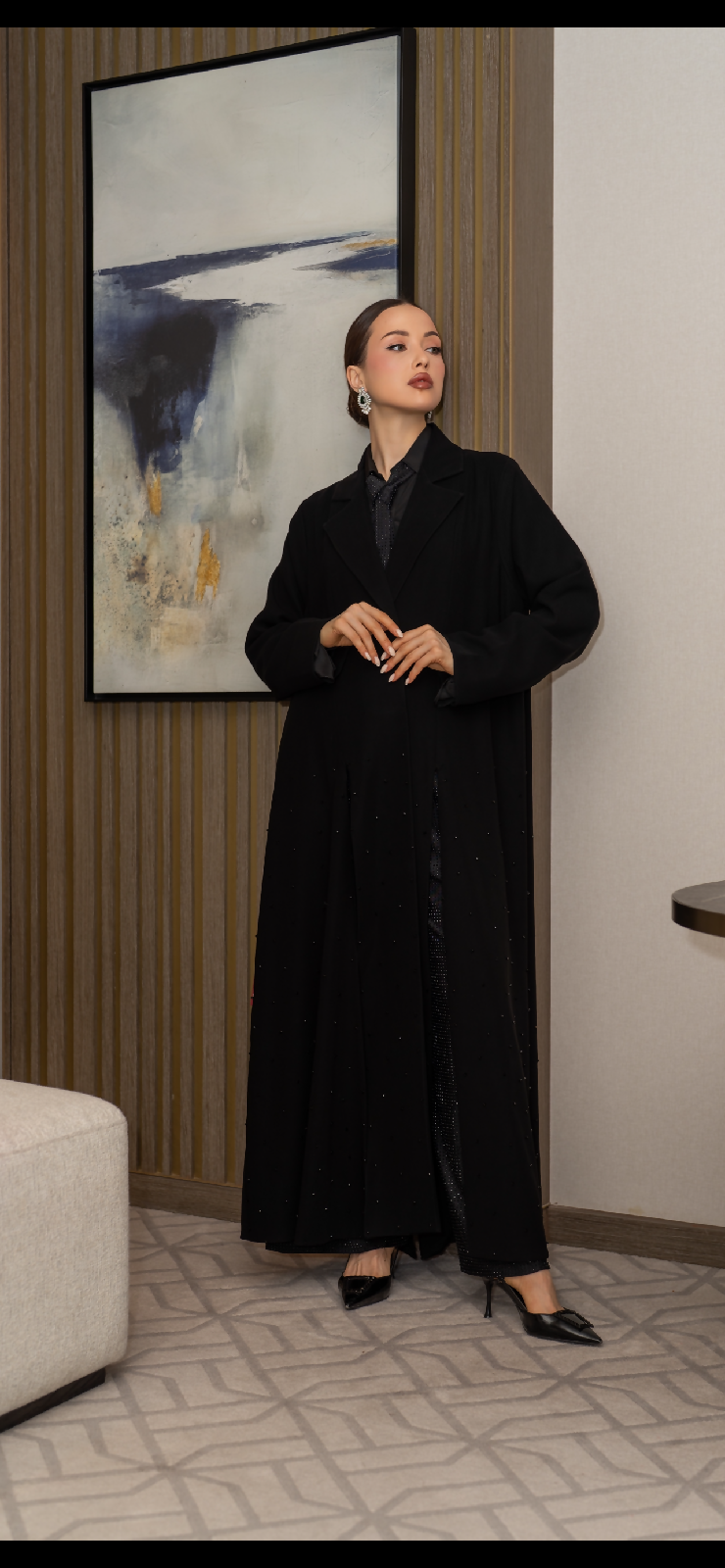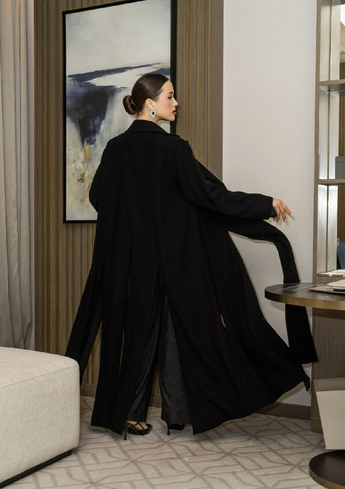 عباءة بقصة بليزر سوداء بالكامل مبطنة بالحرير الفاخر